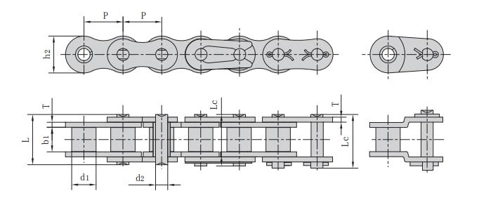 鏈條型號 節距 滾子直徑 內節內寬 銷軸直徑 銷軸長度 內鏈板高度 鏈板厚度 抗拉強度 每米長重