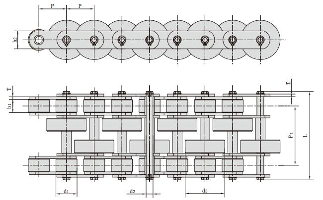 鏈號 節距 滾子直徑 內節內寬 銷軸直徑 銷軸長度 鏈板高度 鏈板厚度 排距 抗拉強度 每米長重