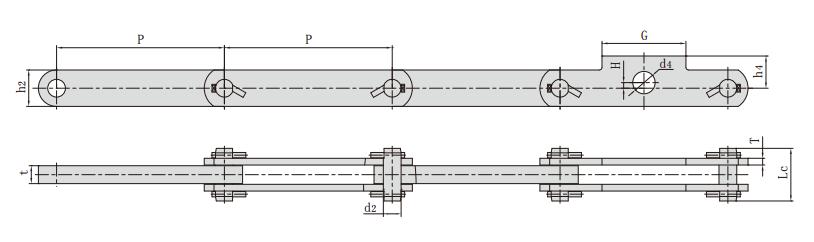鏈號 節距 銷軸直徑 銷軸長度 內鏈板高度 鏈板厚度 附板尺寸 抗拉強度 每米長重