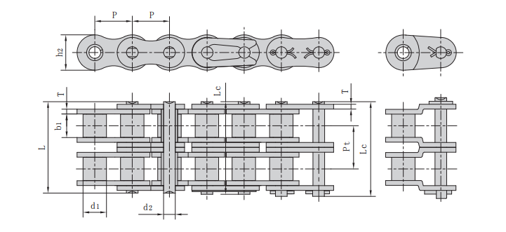 節距 滾子直徑 內節內寬 銷軸直徑 銷軸長度 內鏈板高度 鏈板厚度 排距 抗拉強度 平均抗拉強度 每米長重