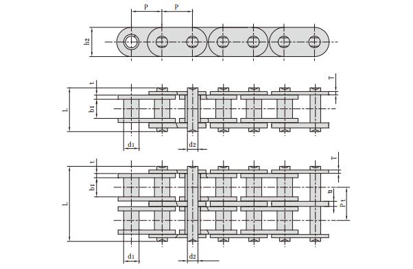 汽車發動機正時套筒鏈主要型號有:節距,套筒直徑,內節內寬,銷軸直徑,銷軸長度,內鏈板高度,鏈板厚度,排距,抗拉強度,每米長重