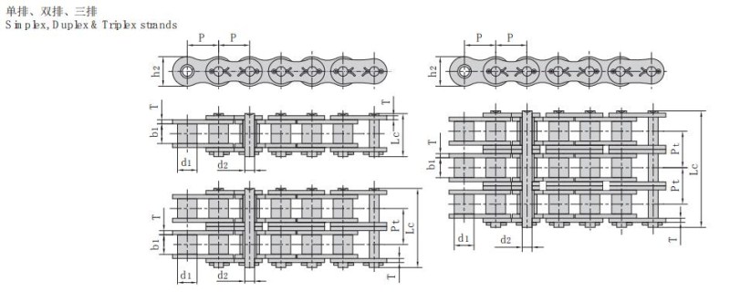 鏈號(hào) 節(jié)距 滾子直徑 內(nèi)節(jié)內(nèi)寬 銷軸直徑 銷軸長度 內(nèi)鏈板高度 鏈板厚度 排距 抗拉強(qiáng)度 平均抗拉強(qiáng)度 每米長重