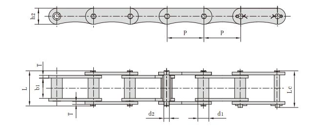 鏈號(hào) 節(jié)距 滾子直徑 內(nèi)節(jié)內(nèi)寬 銷軸直徑 銷軸長(zhǎng)度 鏈板高度 鏈板厚度 抗拉強(qiáng)度 每米長(zhǎng)重