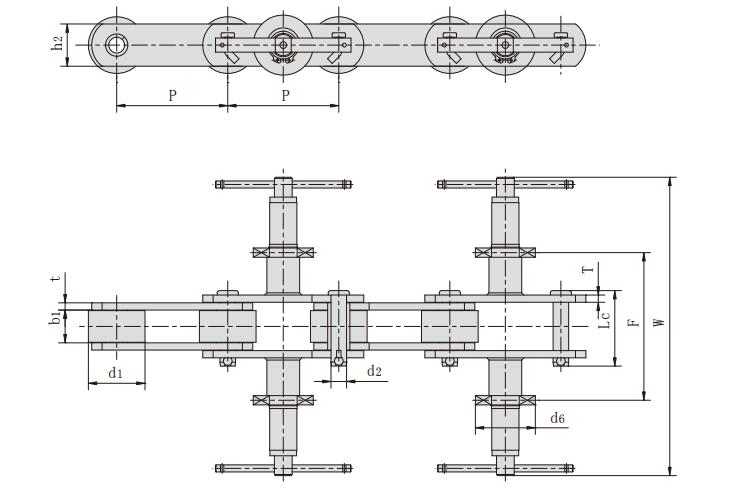 鏈號 節距 滾子直徑 內節內寬 銷軸直徑 銷軸長度 鏈板高度 鏈板厚度 附件尺寸 抗拉強度
