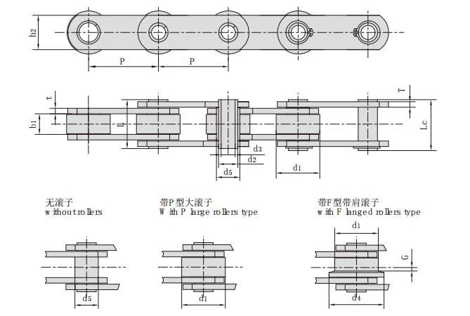 鏈號(hào) 節(jié)距 滾子尺寸 套筒直徑 內(nèi)節(jié)內(nèi)寬 銷軸直徑 鏈板高度 銷軸長(zhǎng)度 鏈板厚度 抗拉強(qiáng)度