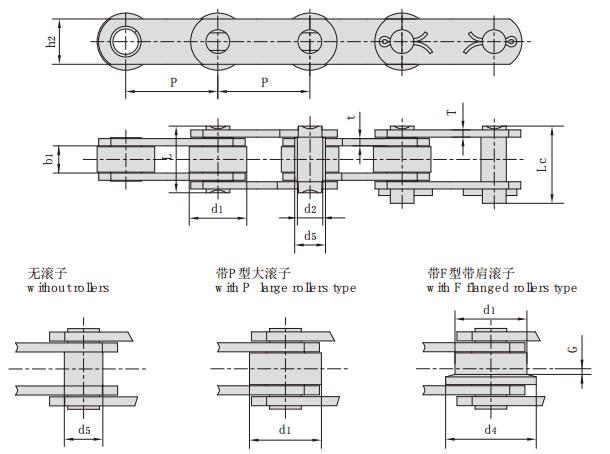 鏈號(hào) 節(jié)距 滾子尺寸 套筒直徑 內(nèi)節(jié)內(nèi)寬 銷軸直徑 鏈板高度 銷軸長(zhǎng)度 鏈板厚度 抗拉強(qiáng)度