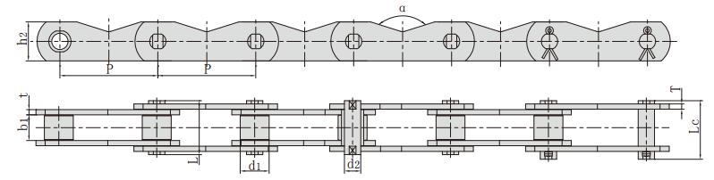 鏈號 節距 滾子直徑 內節內寬 銷軸直徑 銷軸長度 鏈板尺寸 抗拉強度 平均抗拉強度 每米長重