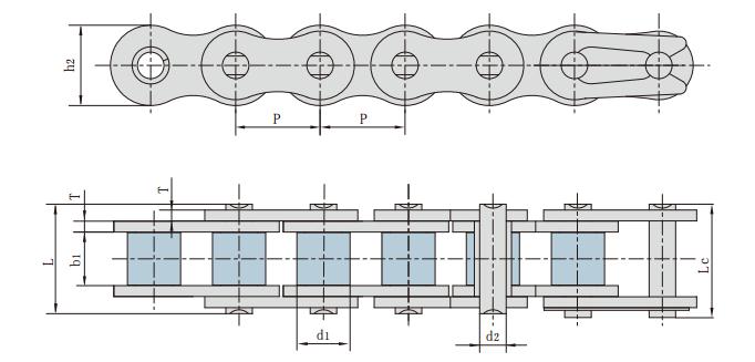 鏈號 節距 滾子直徑 內節內寬 銷軸直徑 銷軸長度 內鏈板高度 鏈板厚度 抗拉強度 平均抗拉強度 每米長重